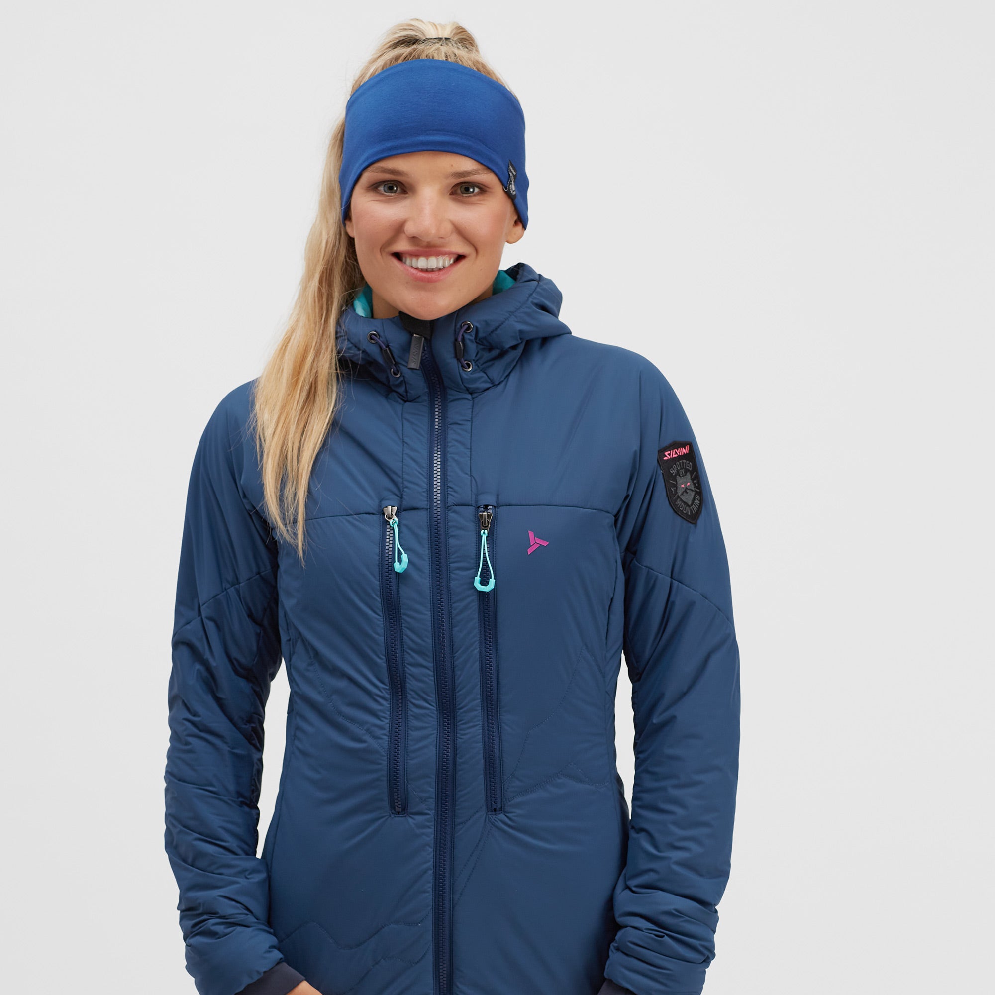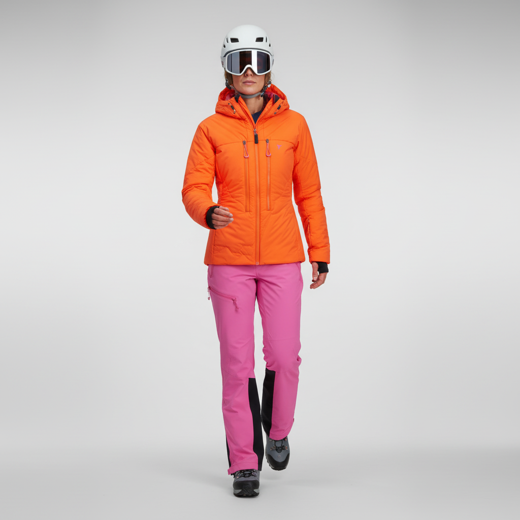 Women's insulated windproof jacket for ski mountaineers to protect against cold with Primaloft® Gold Insulation Active 80 g. The jacket is lightweight and breathable, with external and internal pockets for climbing skins.